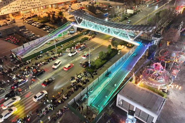 印象濟(jì)南·泉世界作為濟(jì)南西部重要的文旅商業(yè)綜合體,長期面臨人車交織的通行壓力與安全隱患。本次建設(shè)的天橋全長47.3米,橋面寬5米,以“雄鷹展翅”為造型,將橋體結(jié)構(gòu)、材質(zhì)、色彩進(jìn)行巧妙融合,實現(xiàn)人車分流、保障通行安全,成為串聯(lián)不同風(fēng)貌街區(qū)的景觀紐帶。該項目直面商圈出行痛點,選址于人流密集區(qū)域,南北雙側(cè)配備梯道與垂直電梯,全面貫徹全齡友好、無障礙通行理念,全力打造一座讓市民安心、讓城市暖心的“連心橋”。